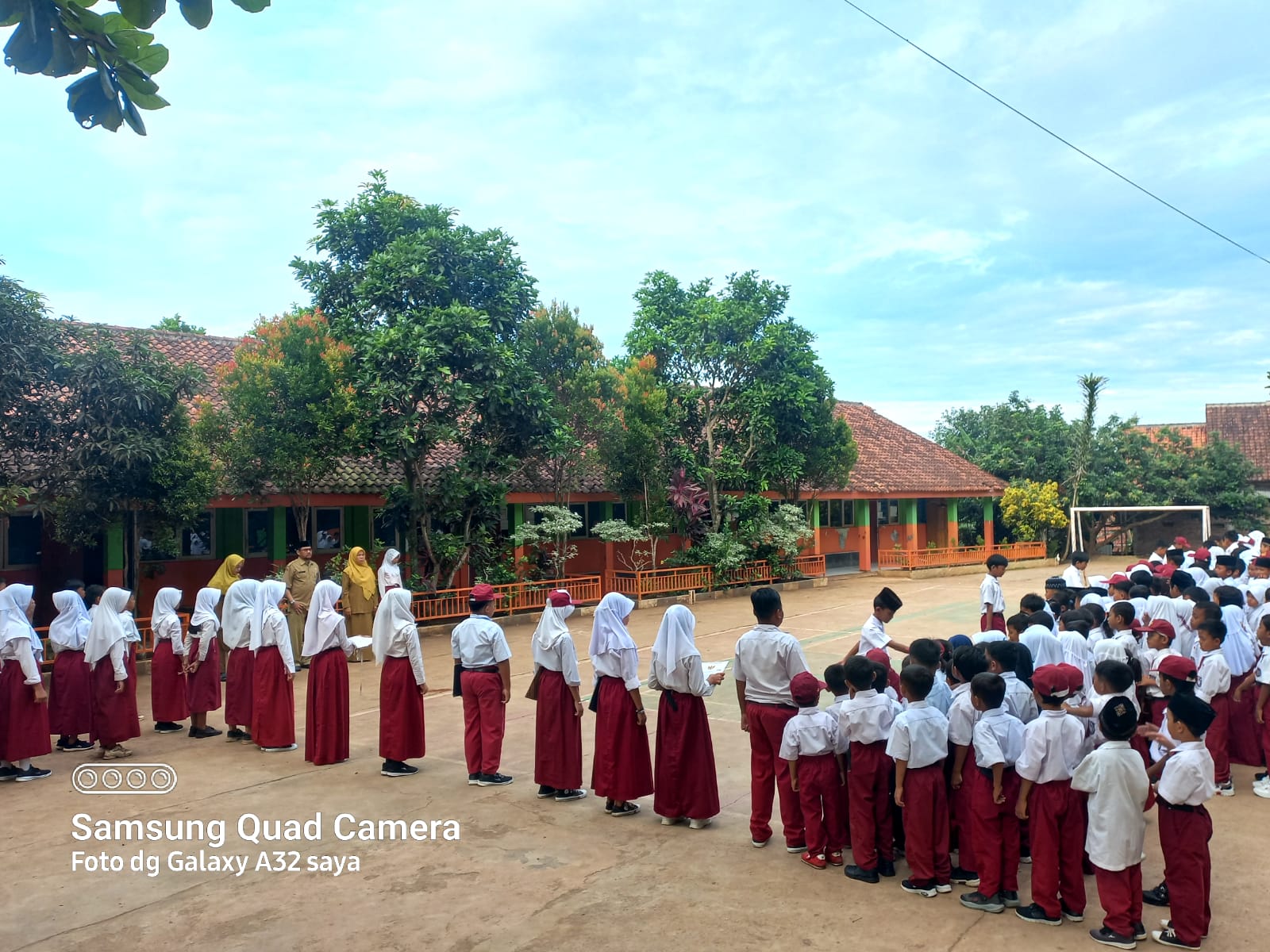 Tidak hanya anak-anak yang riang gembira di hari pertama masuk sekolah, Kepala Sekolah Anas Abdullah, S.Pd, bersama guru-guru pun nampak antusias berbaris di gerbang sekolah menyambut Siswa dan Siswi anak-anak Sekolah dengan penuh Ceria.